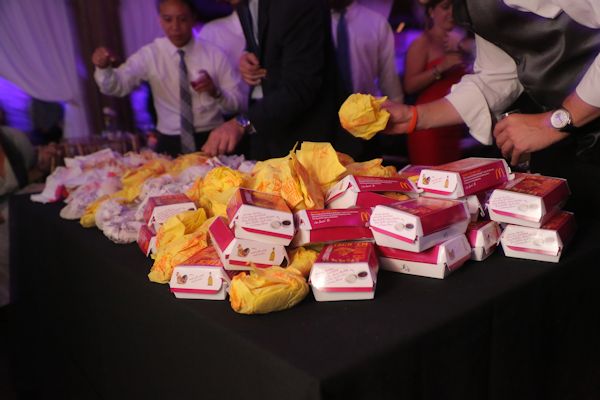 Numerous delicious courses were served family style after the gorgeous cocktail hour on the balconies. Nicole and Lukas hired (my favorite videographer) MPA Productions to travel to NYC to film them that week for a little pre-wedding fun. Nicole surprised Lukas during dinner at the wedding by showing their guests this part! It was a great idea she had and the guests just loved it! After the band rocked the house for hours, a DJ stepped in finishing the night spinning away. Guests enjoyed a photo booth with matching damask backdrop, delicious cake, candlelit ambiance and late night McDonalds delivery.